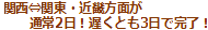| 当社では、関西⇒関東・近畿便が毎週3往復出ています。そこで、混載便でも2日から3日で引越完了。他社様では通常なら5日〜10日間はかかりますが、毎週3往復という圧倒的な増便により、引越日程の短縮に成功しました。 |